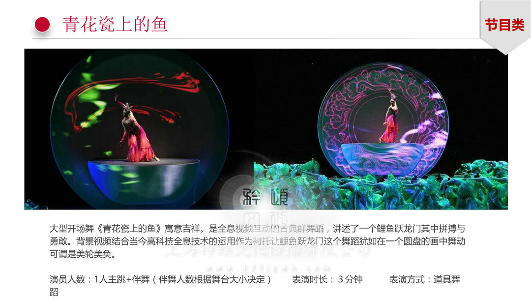 青花瓷上的鱼节目类:大型开场舞《青花瓷上的鱼》寓意吉祥。是全息视频互动的古典群舞蹈,讲述了一个鲤鱼跃龙门其中拼搏与勇敢。背景视频结合当今高科技全息技术的运用作为衬托让鲤鱼跃龙门这个舞蹈犹如在一个圆盘的画中舞动可谓是美轮美奂。