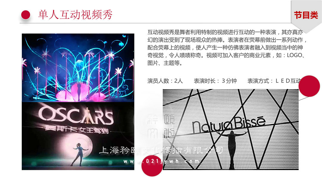 单人互动视频秀节目类:互动视频秀是舞者利用特制的视频进行互动的一种表演,其亦真亦幻的演出受到了现场观众的热捧。表演者在荧幕前做出一系列动作,配合荧幕上的视频,使人产生一种仿佛表演者融入到视频当中的神奇视觉,令人啧啧称奇。视频可加入客户的商业元素,如:LOGO、图片、主题等。